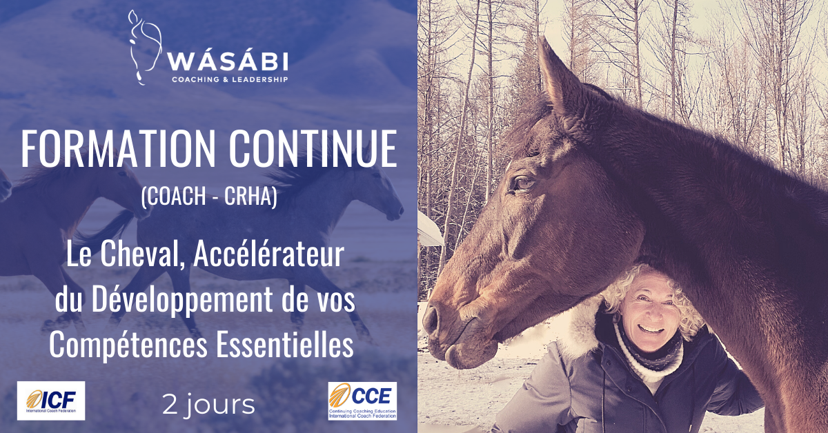 Recevoir le feedback d’un cheval, c’est apprendre sur notre présence à nous même, notre présence à l’autre et à tout ce qui se passe « maintenant ». C’est apprendre sur notre façon d’entrer en relation avec soi et avec l’autre, sur notre impact et l’espace que nous occupons et celui que nous laissons à l’autre dans une relation. C’est aussi apprendre sur notre capacité à s’exprimer clairement, de façon authentique. Voilà en quelques mots l’invitation à expérimenter au travers des interactions cheval-humain l’amélioration accélérée de trois compétences essentielles en coaching : Construire un climat fondé sur la confiance et le respect, Exercer une présence de coach, Établir une communication directe. Trois compétences « pivot » qui pavent la voie aux questions puissantes, aux feedbacks percutants, à l’exploration des possibilités, aux découvertes surprenantes, etc.